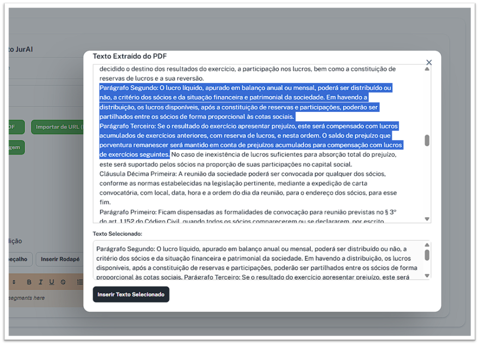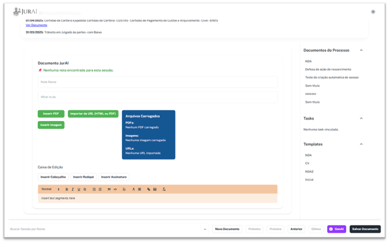 A plataforma integra de forma processos por meio de credenciais específicas para advogados, permitindo o cruzamento automatizado de informações jurídicas usando OCR de imagens e PDFs. Combinando múltiplas fontes de dados, a solução utiliza inteligência artificial para gerar textos contextualizados de forma precisa, além de oferecer templates pré-configurados que aumentam a produtividade na criação de documentos. Todo o processo é potencializado por recursos de IA integrados para edição, redação, tradução e revisão de conteúdos com eficiência e qualidade.